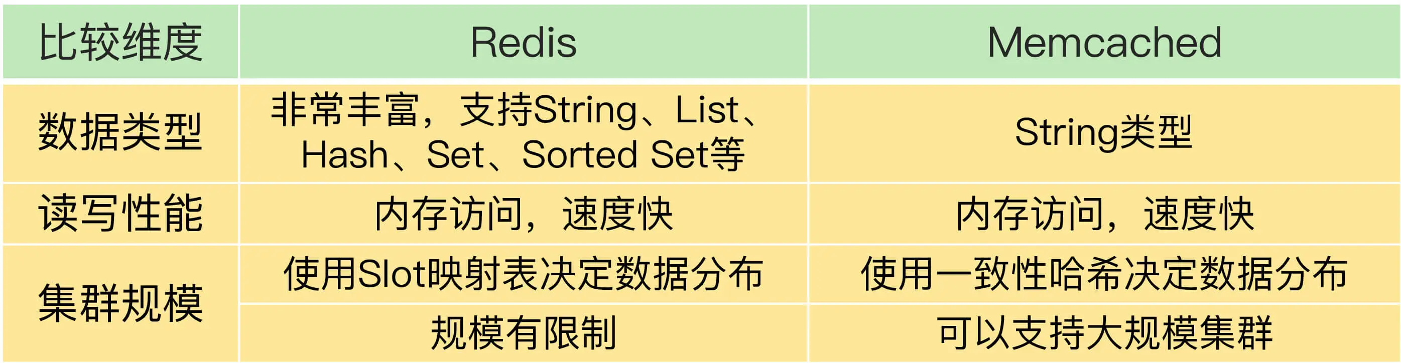 从可扩展性来看,Memcached 优于 Codis,Codis 优于 Redis Cluster。所以,如果实际业务需要大规模集群,建议你优先选择 Codis 或者是基于一致性哈希的 Redis 切片集群方案。