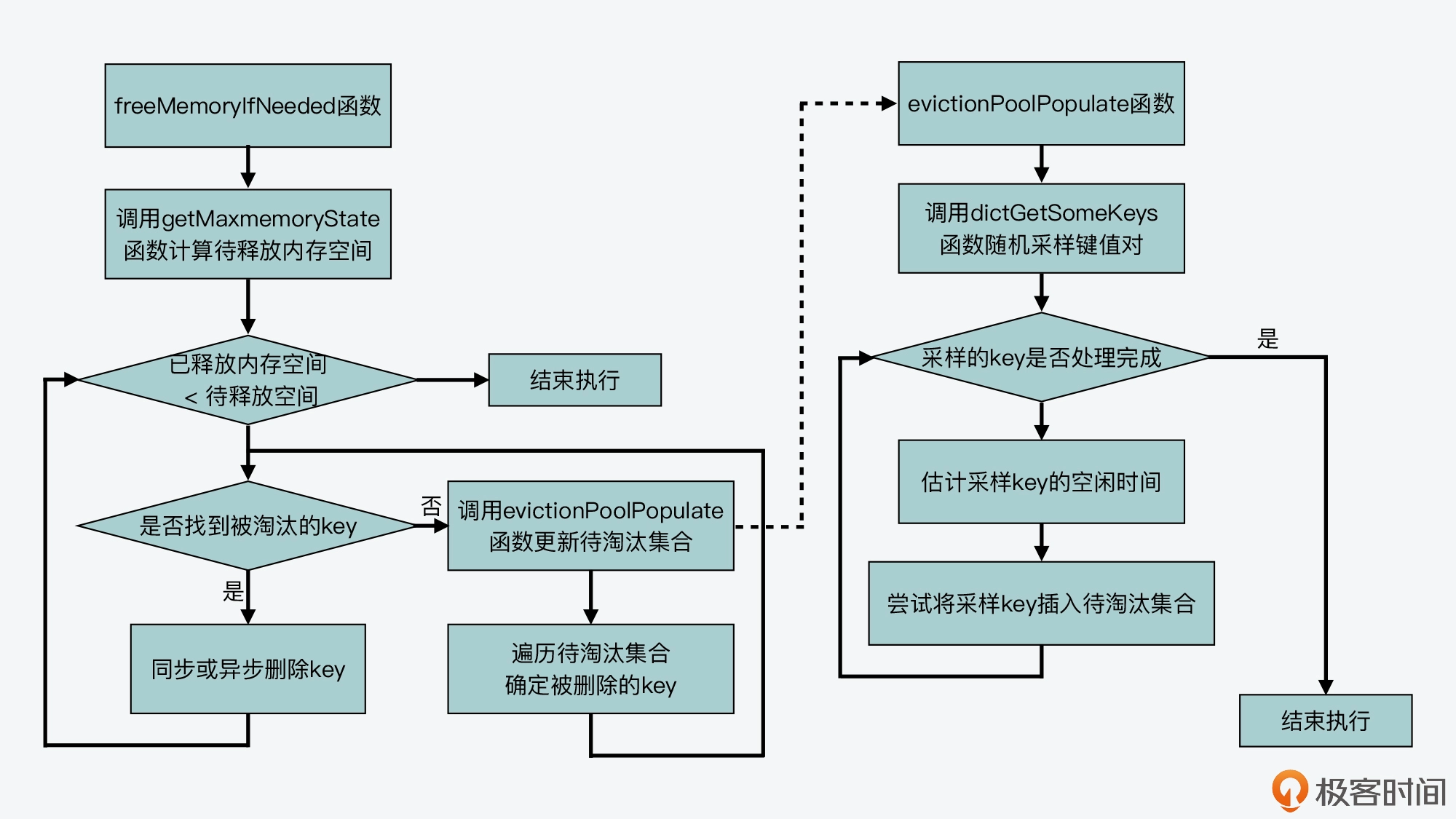 下图就展示了 freeMemoryIfNeeded 函数涉及的基本流程,你可以再来整体回顾下。