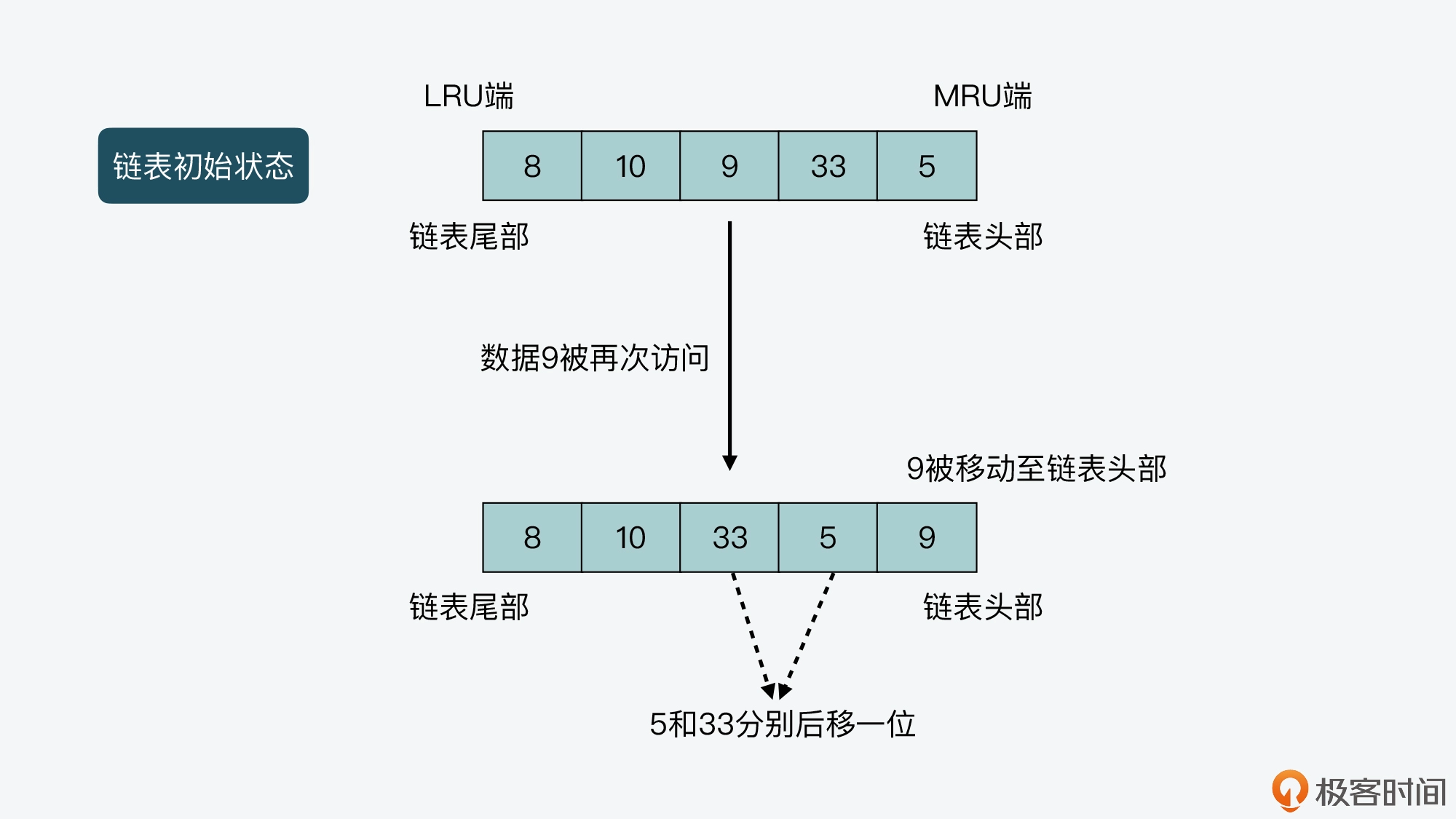 下图就展示了 LRU 算法执行过程的第二种情况,你可以看下。其中,链表长度为 5,从链表头部到尾部保存的数据分别是 5,33,9,10,8。假设数据 9 被访问了一次,那么 9 就会被移动到链表头部,同时,数据 5 和 33 都要向链表尾部移动一位。