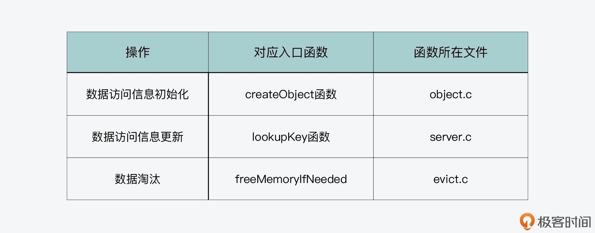 首先,我们要知道,LFU 算法和 LRU 算法的基本步骤,实际上是在相同的入口函数中执行的。上节课围绕 LRU 算法的实现,我们已经了解到这些基本步骤包括数据访问信息的初始化、访问信息更新,以及实际淘汰数据。这些步骤对应的入口函数如下表所示,你也可以再去回顾下上节课的内容。