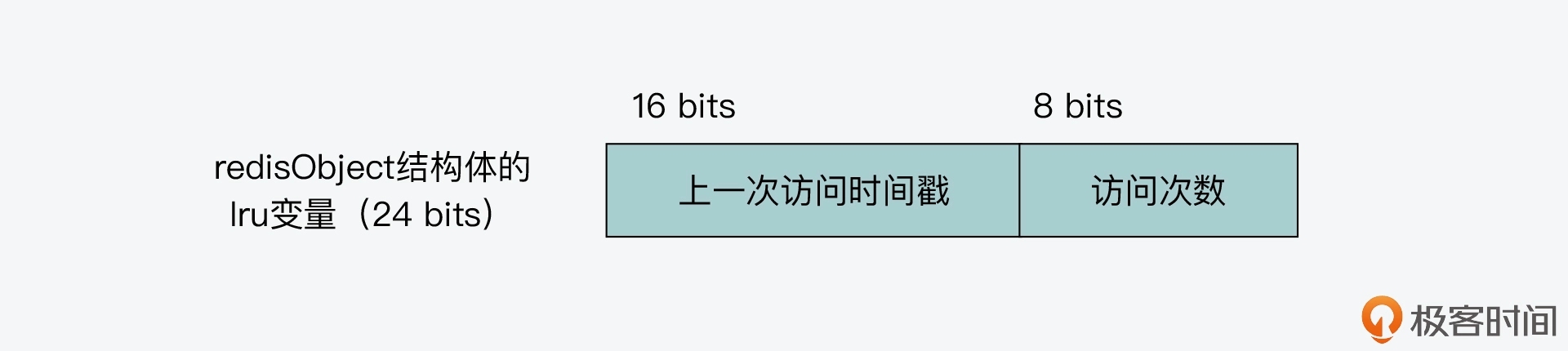 具体来说,当 lru 变量用来记录 LFU 算法的所需信息时,它会用 24 bits 中的低 8 bits 作为计数器,来记录键值对的访问次数,同时它会用 24 bits 中的高 16 bits,记录访问的时间戳。下图就展示了用来记录访问频率时的 lru 变量内容,你可以看下。