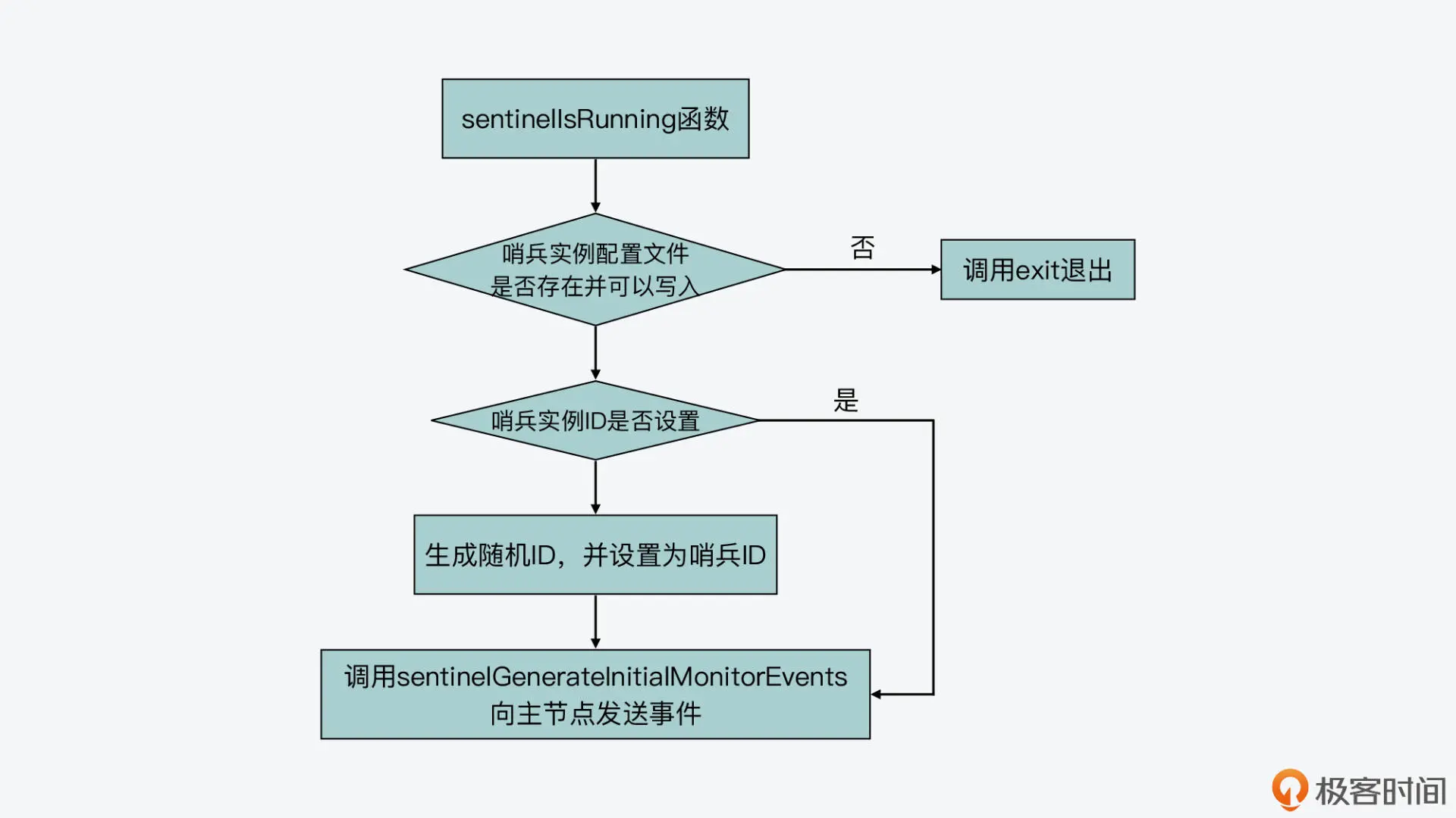 sentinelIsRunning 函数的执行逻辑比较简单,它首先会确认哨兵实例的配置文件存在并且可以正常写入。然后,它会检查哨兵实例是否设置了 ID。如果没有设置 ID 的话,sentinelIsRunning 函数就会为哨兵实例随机生成一个 ID。