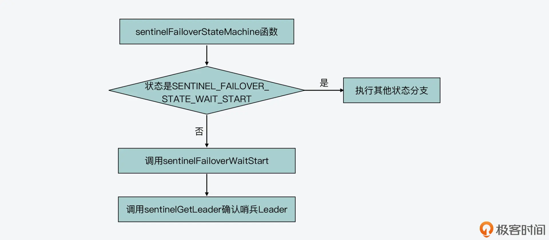 从图中可以看到,sentinelHandleRedisInstance 会先调用 sentinelCheckObjectivelyDown 函数,再调用 sentinelStartFailoverIfNeeded 函数,判断是否要开始故障切换,如果 sentinelStartFailoverIfNeeded 函数的返回值为非 0 值,那么 sentinelAskMasterStateToOtherSentinels 函数会被调用。否则的话,sentinelHandleRedisInstance 就直接调用 sentinelFailoverStateMachine 函数,并再次调用 sentinelAskMasterStateToOtherSentinels 函数。