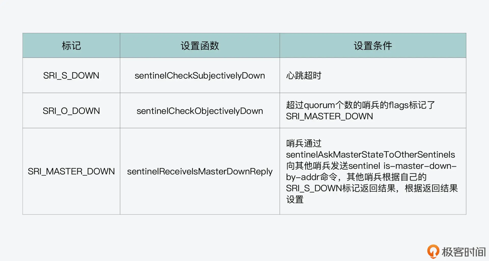 首先,客观下线的判断涉及三个标记的判断,分别是主节点 flags 中的 SRI_S_DOWN 和 SRI_O_DOWN,以及哨兵实例 flags 中的 SRI_MASTER_DOWN,我画了下面这张表,展示了这三个标记的设置函数和条件,你可以再整体回顾下。