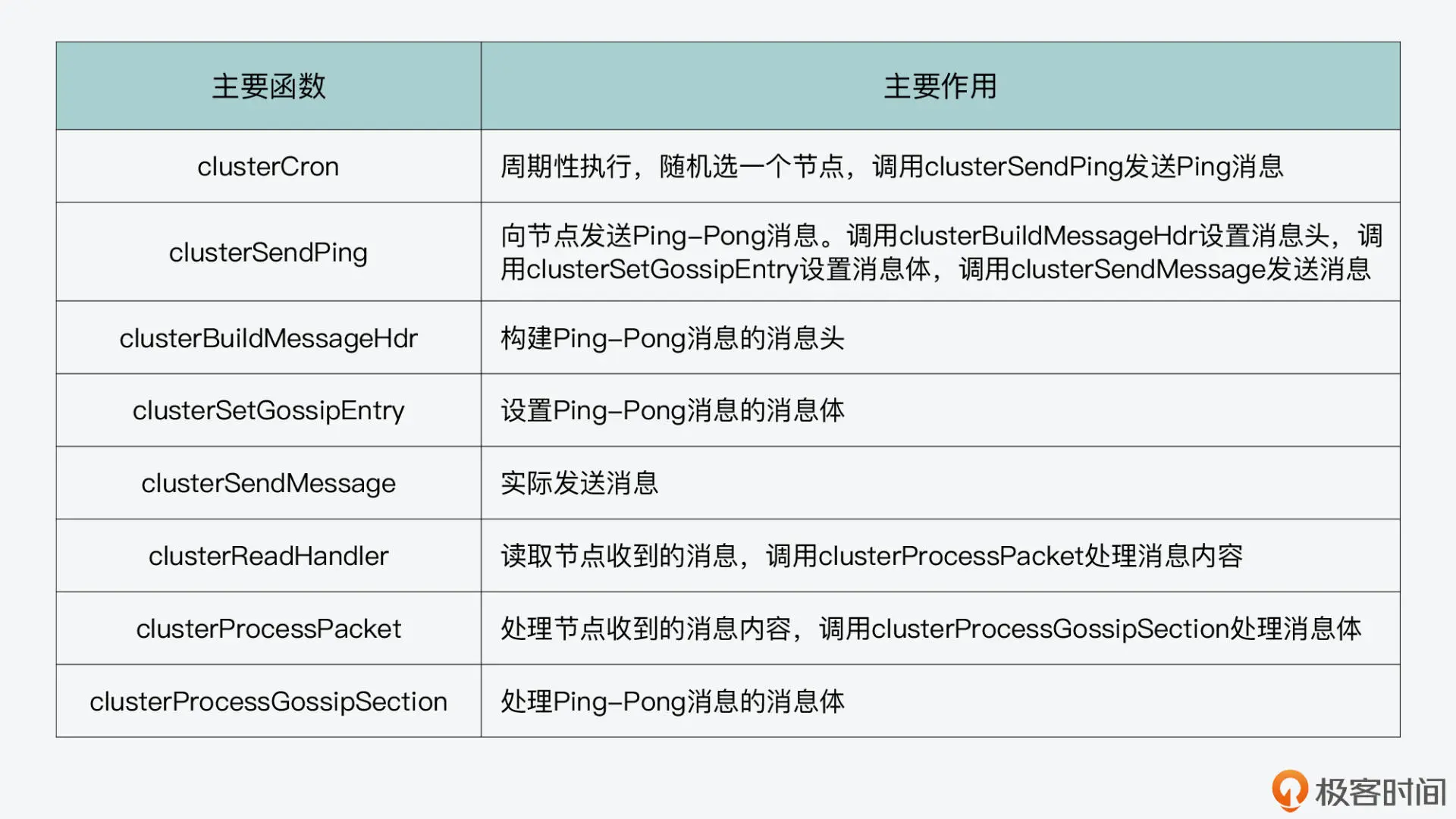 好了,到这里,我们就了解了按照 Gossip 协议发送的 Ping、Pong 消息的整体处理过程。从中,我们也看到了 Redis 实现 Gossip 协议用到的数据结构和主要函数,我画了两张表,分别汇总了刚才介绍的数据结构和函数,你可以再回顾下。