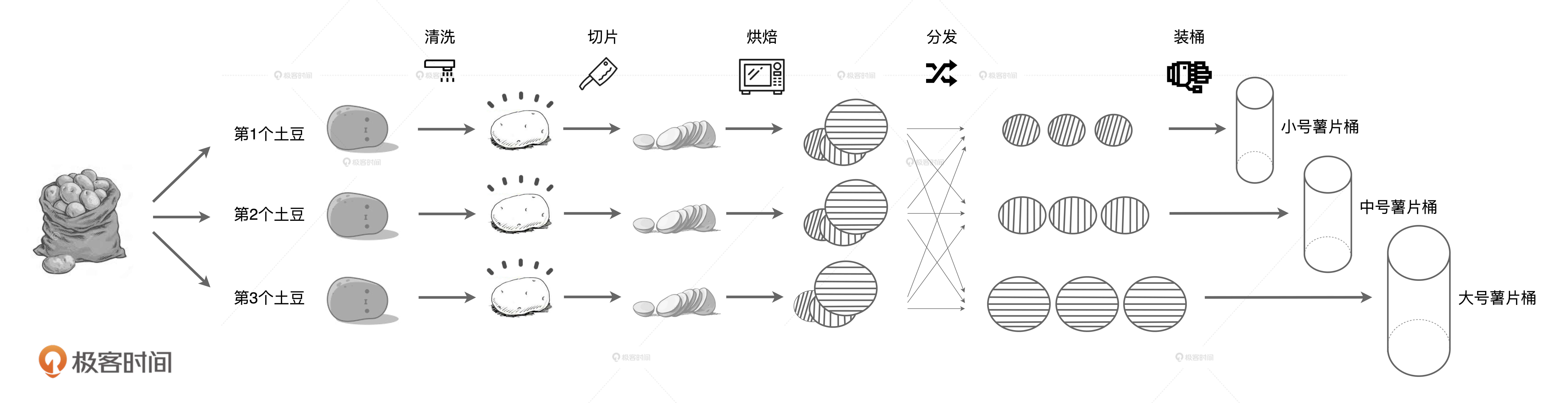 看得出来,这家工坊制作工艺虽然简单,倒也蛮有章法。从头至尾,除了分发环节,3 条流水线没有任何交集。在分发环节之前,每条流水线都是专心致志、各顾各地开展工作:把土豆食材加载到流水线上,再进行清洗、切片、烘焙;在分发环节之后,3 条流水线也是各自装桶,互不干涉、互不影响。流水线的作业方式提供了较强的容错能力,如果某个加工环节出错,工人们只需要往出错的流水线上重新加载一颗新的土豆,整个流水线就能够恢复生产。