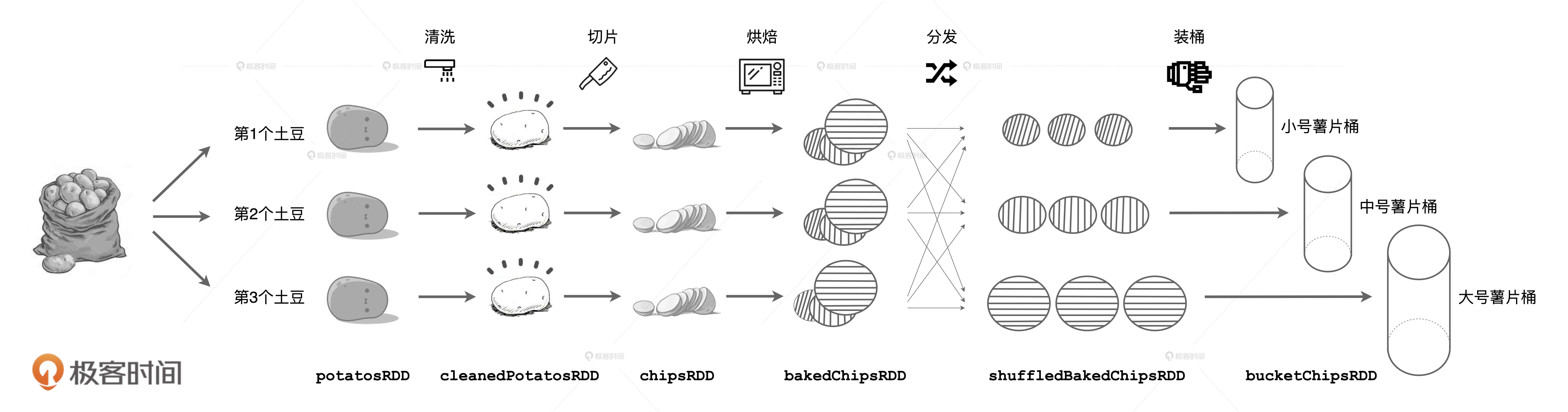 仔细观察,我们发现:刚从地里挖出来的土豆食材、清洗过后的干净土豆、生薯片、烤熟的薯片,流水线上这些食材的不同形态,就像是Spark中RDD对于不同数据集合的抽象。