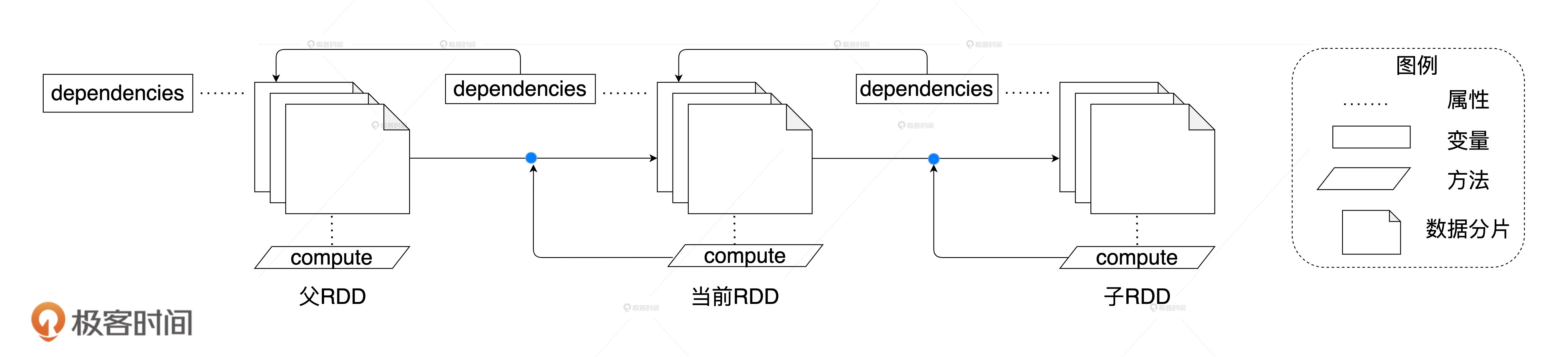 沿着流水线的纵深方向,也就是图中从左向右的方向,每一种食材形态都是在前一种食材之上用相应的加工方法进行处理得到的。每种食材形态都依赖于前一种食材,这就像是RDD中dependencies属性记录的依赖关系,而不同环节的加工方法,对应的刚好就是RDD的compute属性。