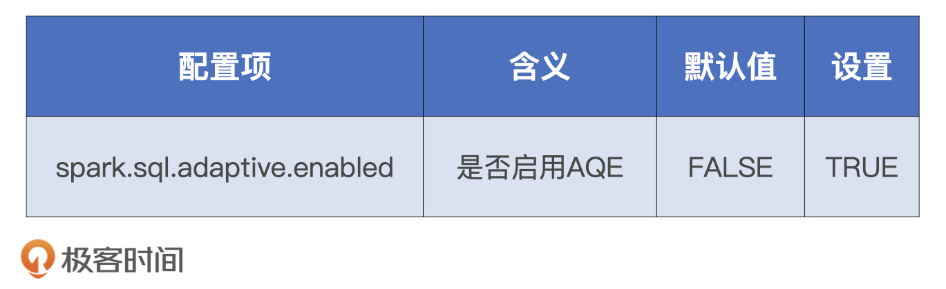 不过,AQE功能默认是关闭的,如果我们想要充分利用自动分区合并、自动数据倾斜处理和Join策略调整,需要把相关的配置项打开,具体的操作如下表所示。