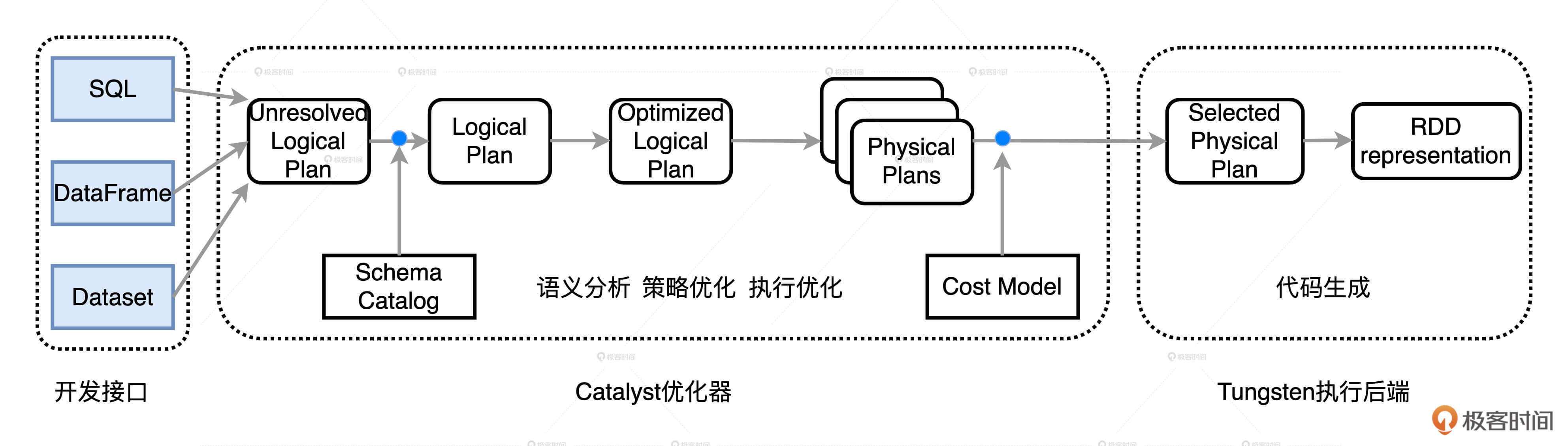 总的来说,通过钨丝计划和AQE,我们完全可以实现低投入、高产出,这其实就是坐享其成的核心原则。除此之外,类似的技巧还有用SQL functions或特征转换算子去取代UDF等等。我非常希望你能在开发过程中去主动探索、汇总这些可以拿来即用的技巧,如果有成果,也期待你在留言区分享。