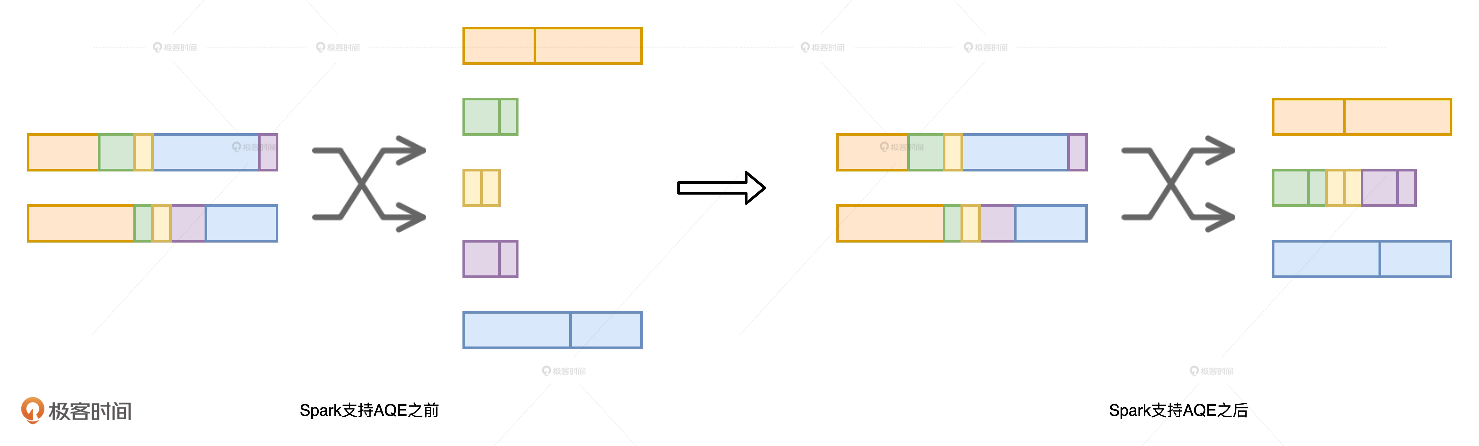 你可能会问:“听上去这么厉害,那AQE具体都有哪些改进呢?”AQE主要带来了3个方面的改进,分别是自动分区合并、数据倾斜和Join策略调整。我们一一来看。