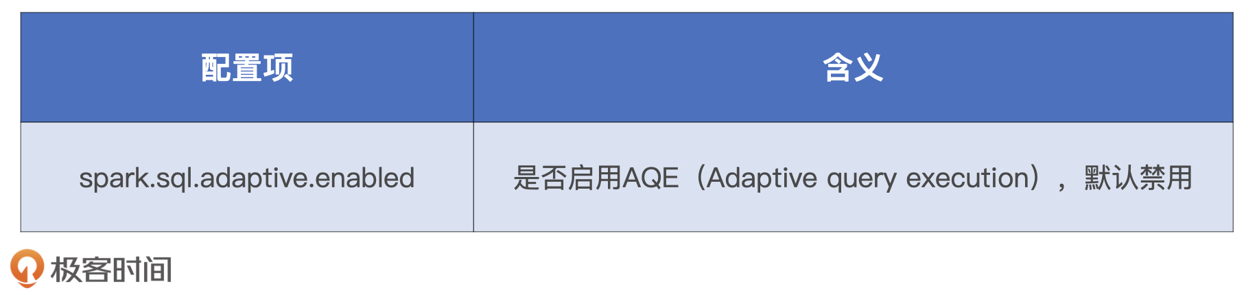 对于Spark SQL大类我们首先要知道,AQE默认是禁用状态,要充分利用AQE提供的3个特性,就是自动分区合并、数据倾斜处理和Join策略调整,我们需要把spark.sql.adaptive.enabled置为true。