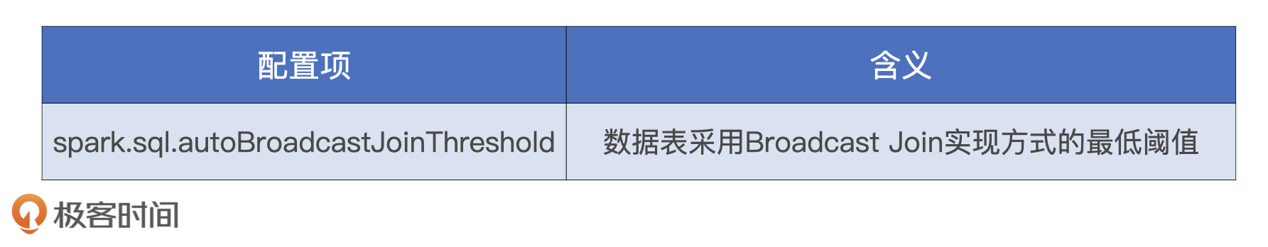 为了让Spark SQL采用Broadcast Joins,开发者要做的,就是让数据表在内存中的尺寸小于autoBroadcastJoinThreshold参数的设定值。