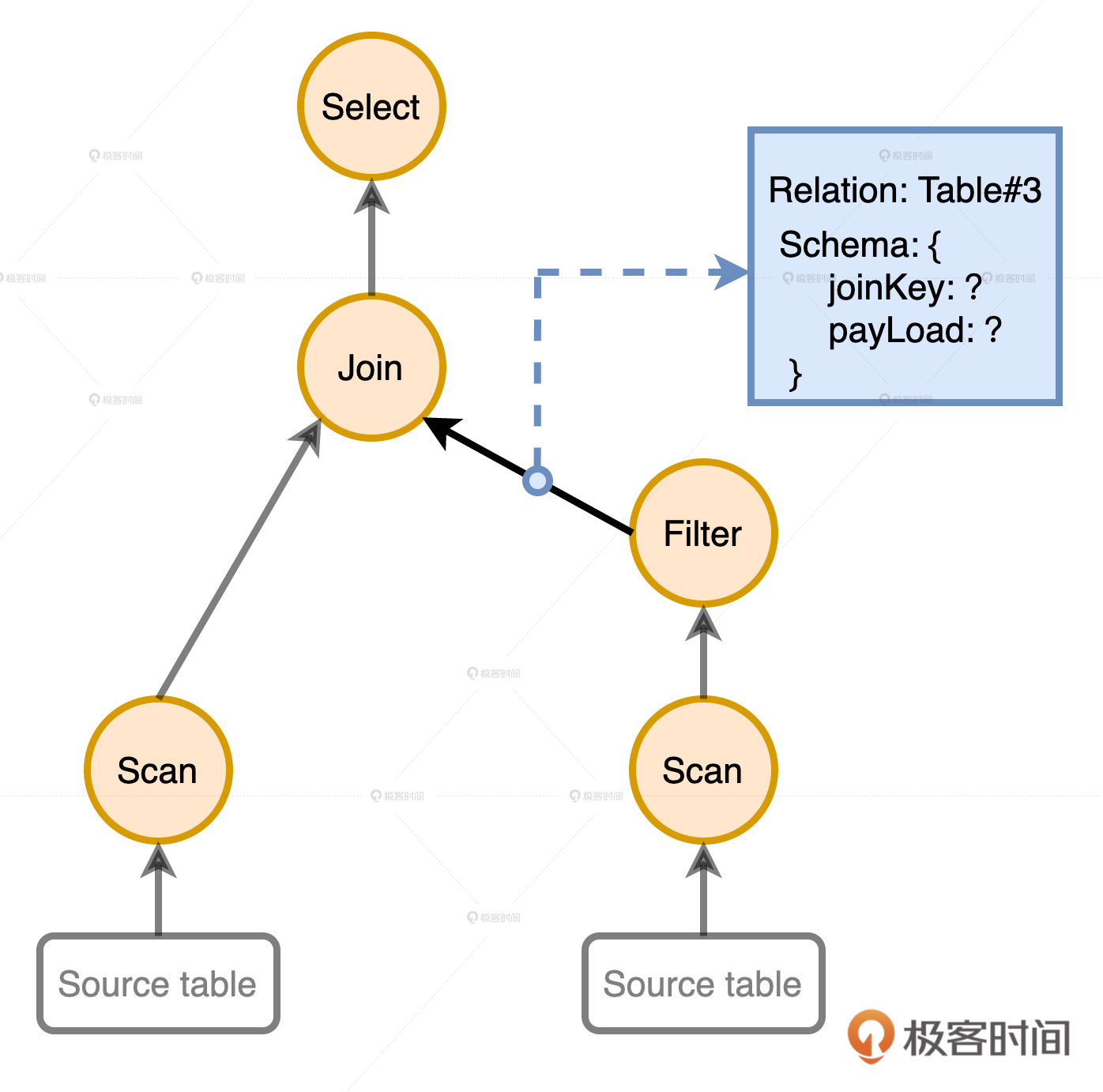 在Spark中,语法树还有个别名叫做“Unresolved Logical Plan”。它正是Catalyst优化过程的起点。之所以取名“Unresolved”,是因为边上记录的关系表和数据列仅仅是一些字符串,还没有和实际数据对应起来。举个例子,Filter之后的那条边,输出的数据列是joinKey和payLoad。这些字符串的来源是DataFrame的DSL查询,Catalyst并不确定这些字段名是不是有效的,更不知道每个字段都是什么类型。