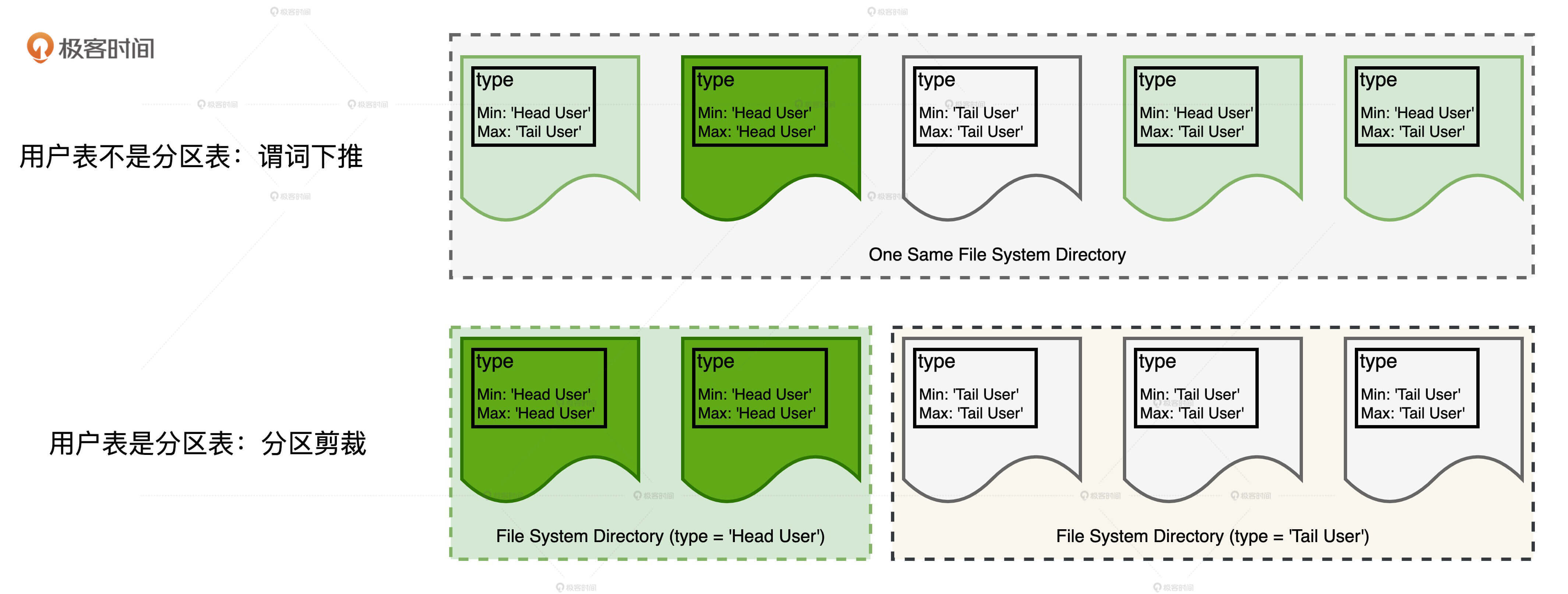 相反,当用户表本身就是分区表时,由于type字段为‘Head User’的数据记录全部存储到前缀为‘Head User’的子目录,也就是图中第二行浅绿色的文件系统目录,这个目录中仅包含两个type字段全部为‘Head User’的数据分片。这样一来,Spark SQL可以完全跳过其他子目录的扫描,从而大幅提升I/O效率。