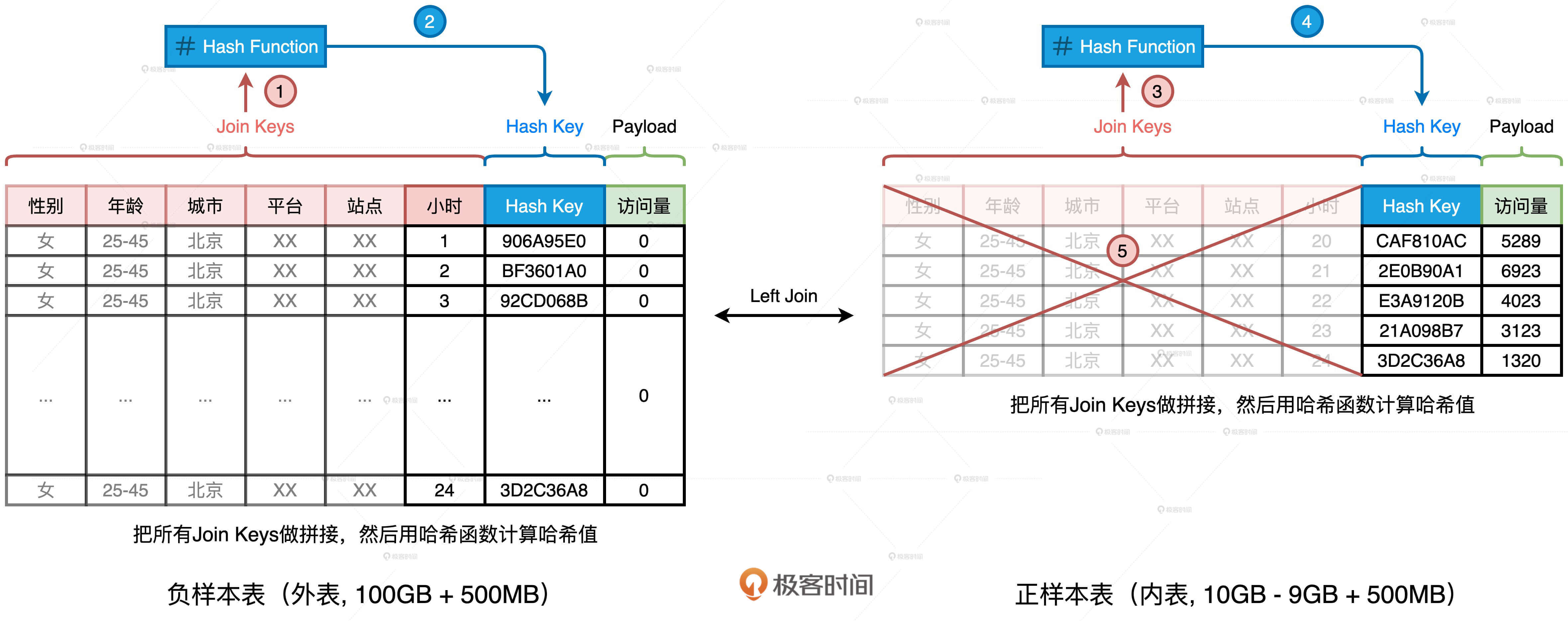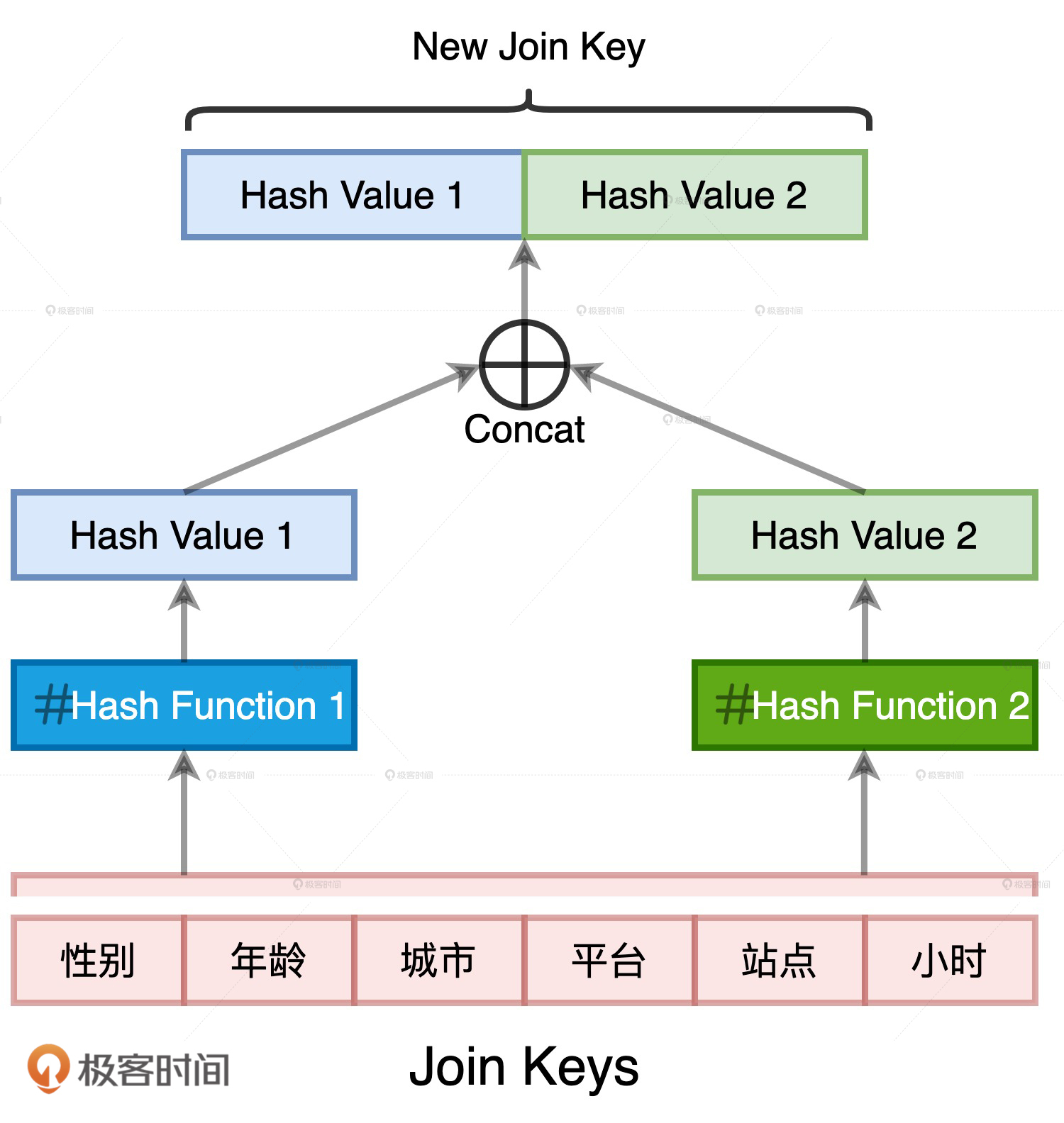 答案是否定的。在上一讲,我们介绍过Hash Join的实现原理,在Build阶段,Hash Join使用哈希算法生成哈希表。在Probe阶段,哈希表一方面可以提供O(1)的查找效率,另一方面,在查找过程中,Hash Keys之间的对比远比Join Keys之间的对比要高效得多。受此启发,我们为什么不能计算Join Keys的哈希值,然后把生成的哈希值当作是新的Join Key呢?