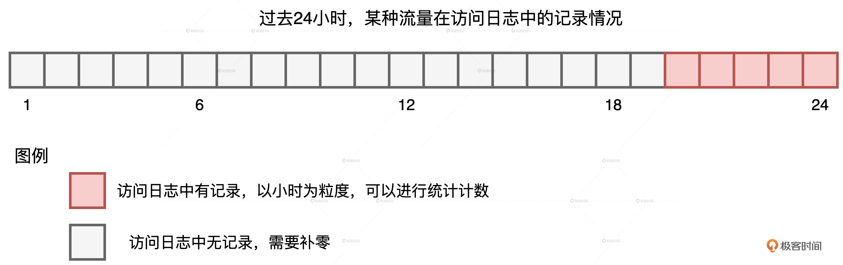 我们可以看到,在过去的24小时中,某种流量仅在20-24点这5个时段有数据记录,其他时段无记录,也就是流量为零。在这种情况下,我们就需要用“零”去补齐缺失时段的序列值。那么我们该怎么补呢?