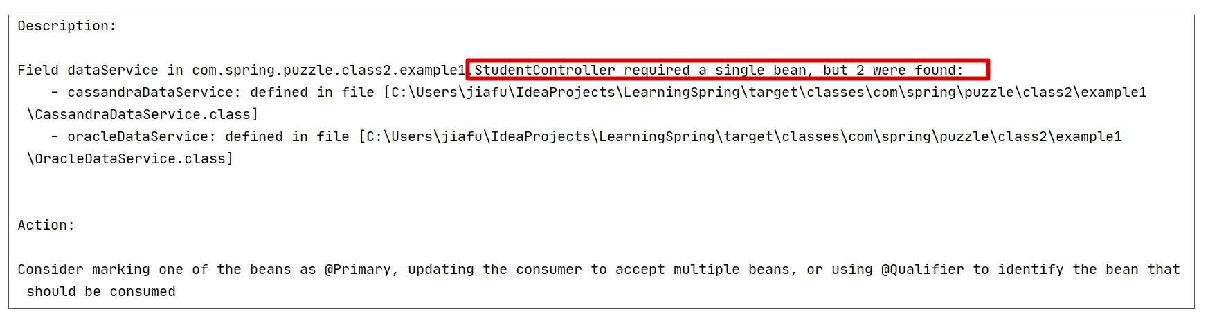顾名思义,我们仅需要一个Bean,但实际却提供了2个(这里的“2”在实际错误中可能是其它大于1的任何数字)。