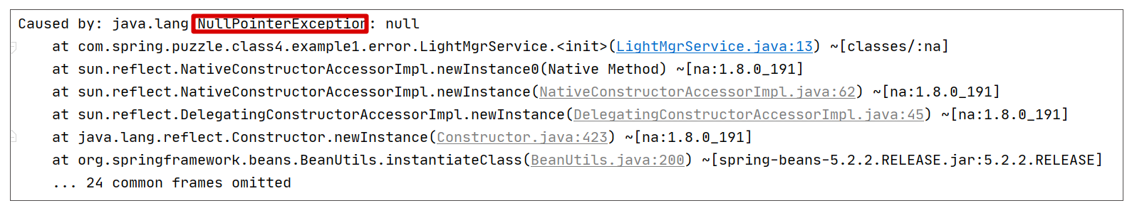 这里因为当前的语言并非 Kotlin,所以最终将调用 ctor.newInstance() 方法实例化用户定制类 LightMgrService,而默认构造器显然是在类实例化的时候被自动调用的,Spring 也无法控制。而此时负责自动装配的 populateBean 方法还没有被执行,LightMgrService 的属性 LightService 还是 null,因而得到空指针异常也在情理之中。