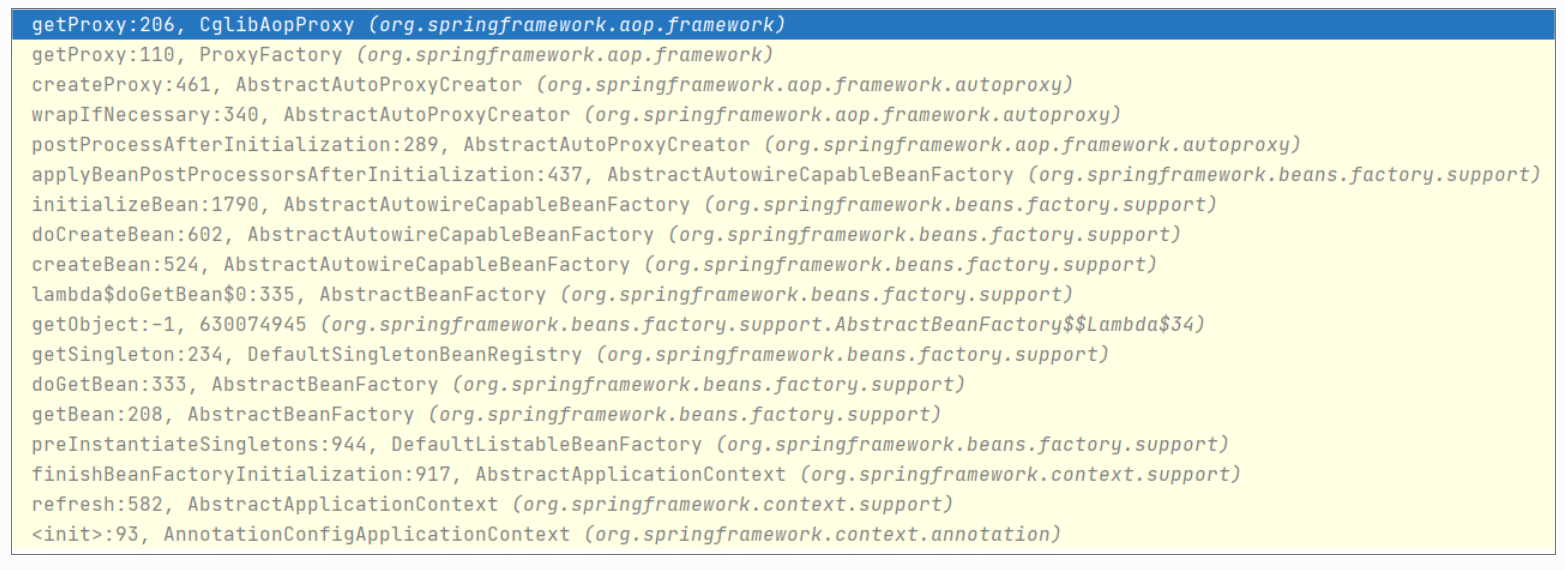 补充完最基本的Spring底层知识和使用知识后,我们具体看下创建代理对象的过程。先来看下调用栈: