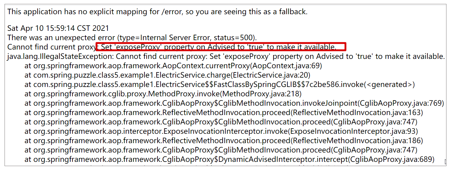 不过使用这种方法有个小前提,就是需要在@EnableAspectJAutoProxy里加一个配置项exposeProxy = true,表示将代理对象放入到ThreadLocal,这样才可以直接通过 AopContext.currentProxy()的方式获取到,否则会报错如下: