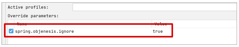 说到这里,我们已经解决了问题。但如果你看得仔细,就会发现,其实你改变一个属性,也可以让产生的代理对象的属性值不为null。例如修改启动参数spring.objenesis.ignore如下: