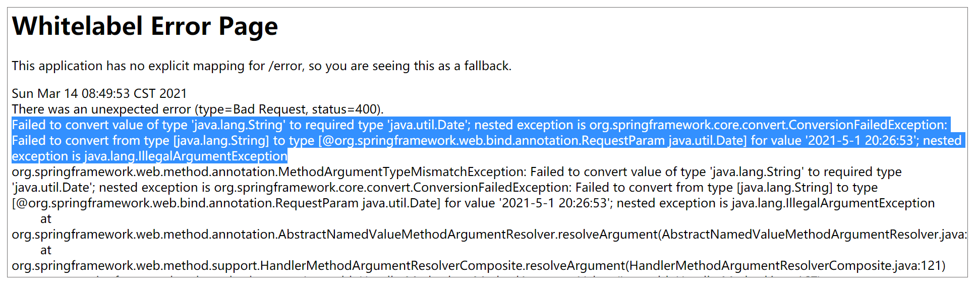 然后,我们使用一些看似明显符合日期格式的 URL 来访问,例如 http://localhost:8080/hi6?date=2021-5-1 20:26:53,我们会发现 Spring 并不能完成转化,而是报错如下: