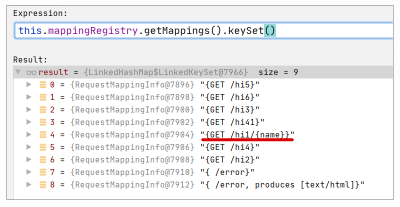 这个步骤执行的代码语句是”this.mappingRegistry.getMappingsByUrl(lookupPath)“,实际上,它是查询 MappingRegistry#urlLookup,它的值可以用调试视图查看,如下图所示: