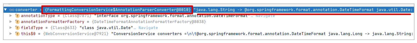 这是因为 AnnotationParserConverter 有目标类型的要求,这点我们可以通过调试角度来看下,参考 FormattingConversionService#addFormatterForFieldAnnotation 方法的调试试图: