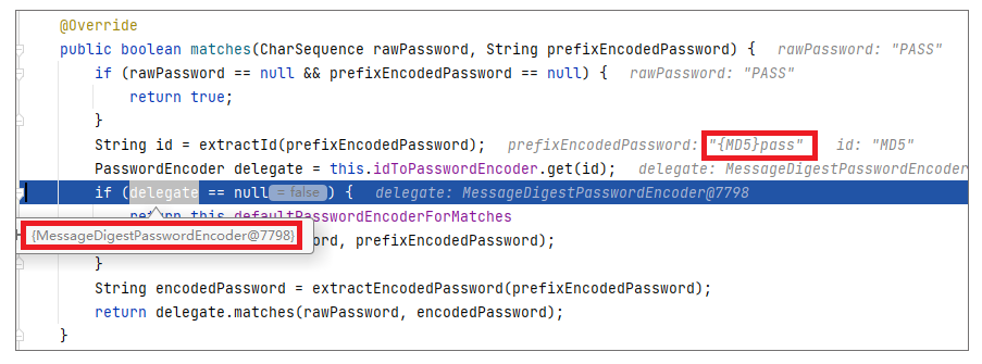 当我们校验用户时,我们会通过下面的代码来匹配,参考DelegatingPasswordEncoder#matches: