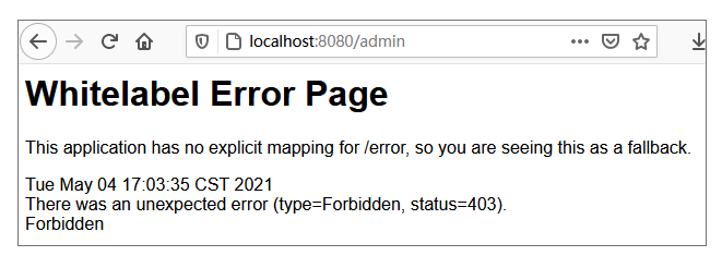 然后我们从浏览器访问我们的接口 http://localhost:8080/admin,使用上述 3 个用户登录,你会发现用户 admin1 可以登录,而 admin2 设置了同样的角色却不可以登陆,并且提示下面的错误: