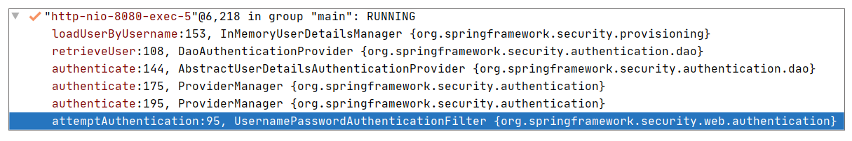 对于案例的代码,最终是通过 “UsernamePasswordAuthenticationFilter” 来完成授权的。而且从调用栈信息可以大致看出,授权的关键其实就是查找用户,然后校验权限。查找用户的方法可参考 InMemoryUserDetailsManager#loadUserByUsername,即根据用户名查找已添加的用户: