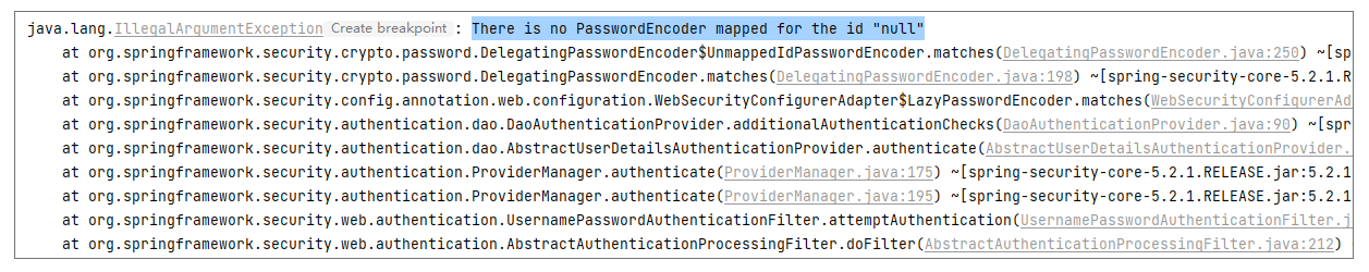 但是当我们发送一个请求时(例如 http://localhost:8080/admin ),就会报错java.lang.IllegalArgumentException: There is no PasswordEncoder mapped for the id “null”,具体错误堆栈信息如下: