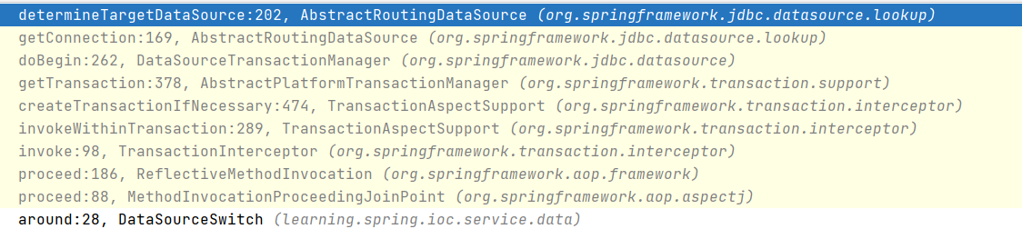 这里的 obtainDataSource().getConnection() 调用到了 AbstractRoutingDataSource.getConnection(),这就与我们实现的功能顺利会师了。
