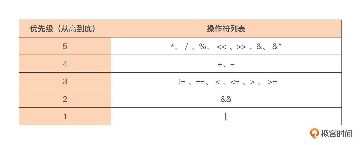 Go语言的操作符是有优先级的。这里你要记住,一元操作符,比如上面的逻辑非操作符,具有最高优先级,其他操作符的优先级如下: