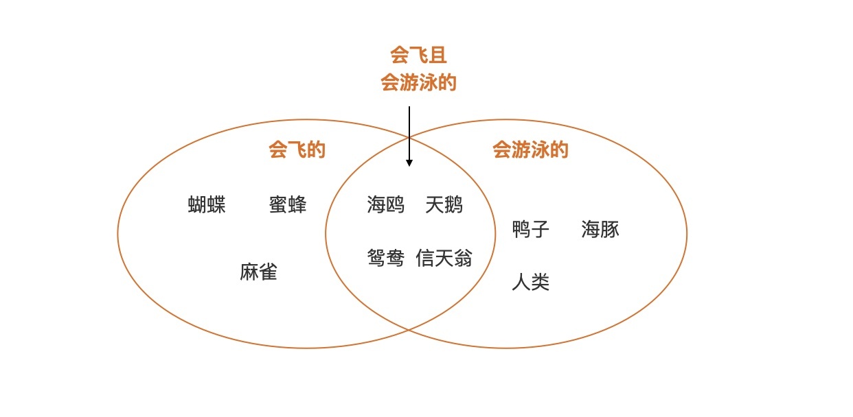 我们看到,“会飞的”、“会游泳的”这两个抽象对应的事物集合,要大于“会飞且会游泳的”所对应的事物集合空间,也就是说“会飞的”、“会游泳的”这两个抽象程度更高。