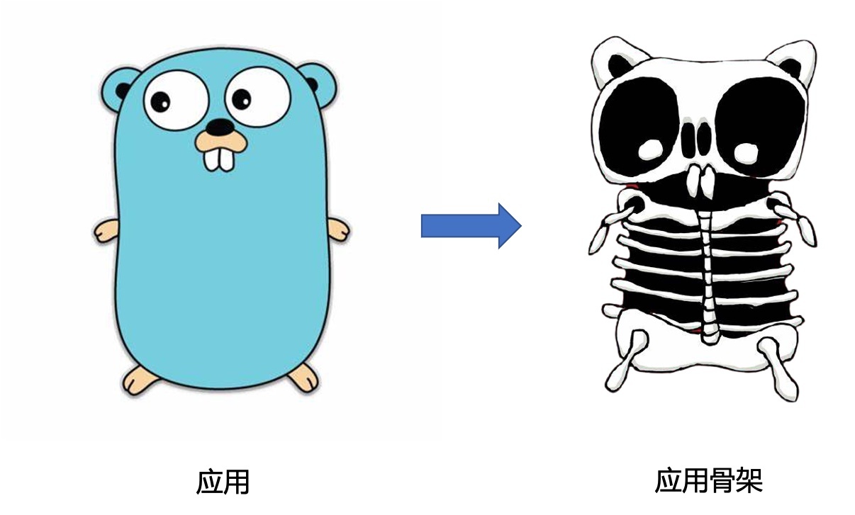 所谓应用骨架,就是指将应用代码中的业务逻辑、算法实现逻辑、错误处理逻辑等“皮肉”逐一揭去后所呈现出的应用结构,这就好比下面这个可爱的Gopher(地鼠)通过X光机所看到的骨骼结构: