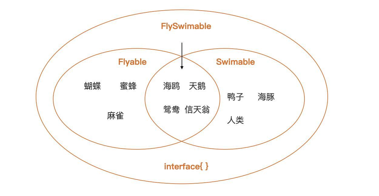 我们可以直观地看到,这张图中的Flyable只有一个Fly方法,FlySwimable则包含两个方法Fly和Swim。我们看到,具有更少方法的Flyable的抽象程度相对于FlySwimable要高,包含的事物集合(7种动物)也要比FlySwimable的事物集合(4种动物)大。也就是说,接口越小(接口方法少),抽象程度越高,对应的事物集合越大。