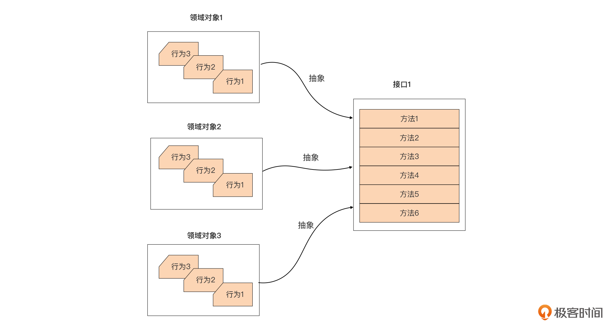 尽管接口不是Go独有的,但专注于接口是编写强大而灵活的Go代码的关键。因此,在定义小接口之前,我们需要先针对问题领域进行深入理解,聚焦抽象并发现接口,就像下图所展示的那样,先针对领域对象的行为进行抽象,形成一个接口集合: