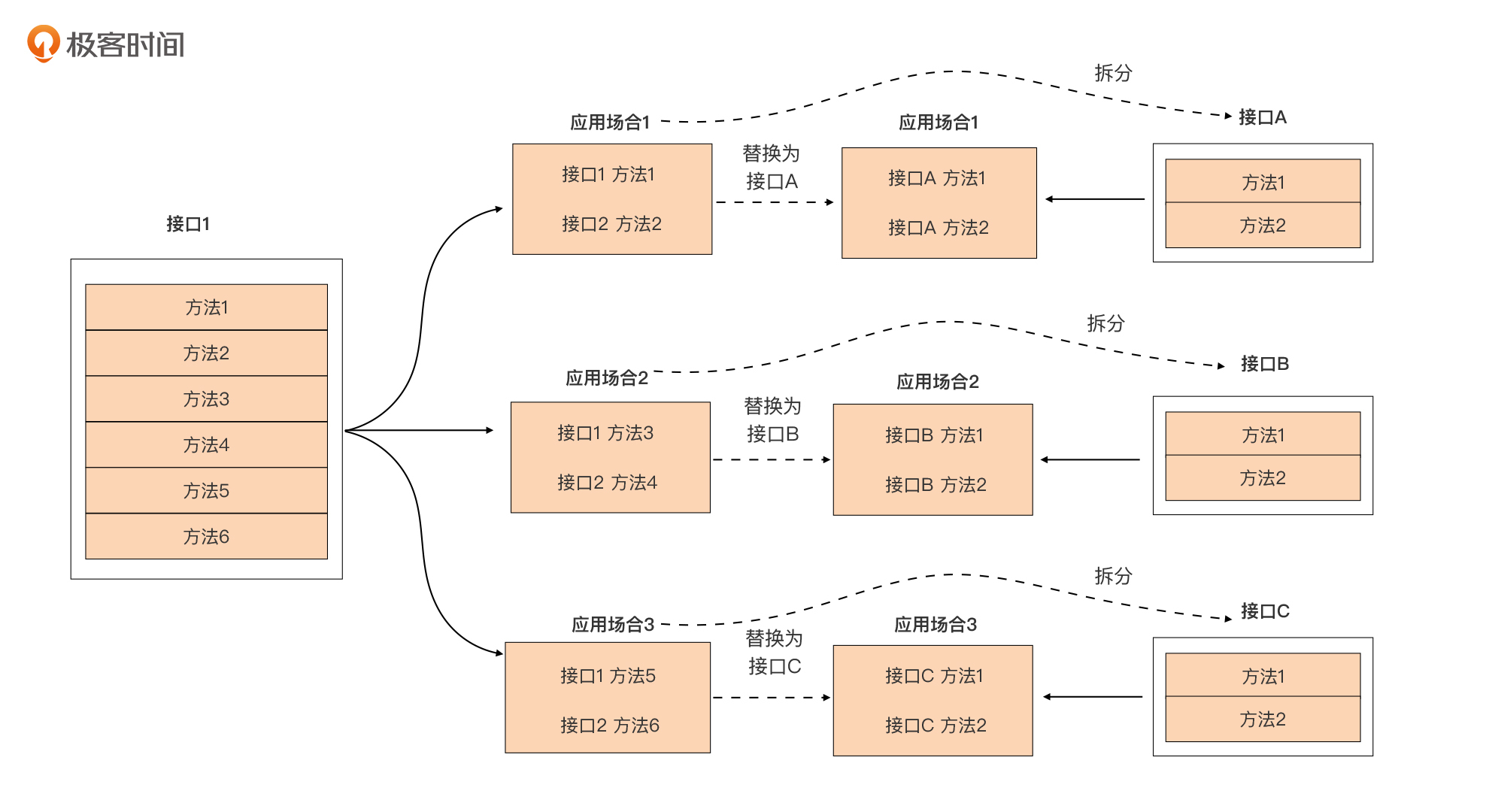 这个时候我们可以将这三组方法分别提取出来放入三个小接口中,也就是将大接口1拆分为三个小接口A、B和C。拆分后,原应用场合1~3使用接口1的地方就可以无缝替换为接口A、B、C了。