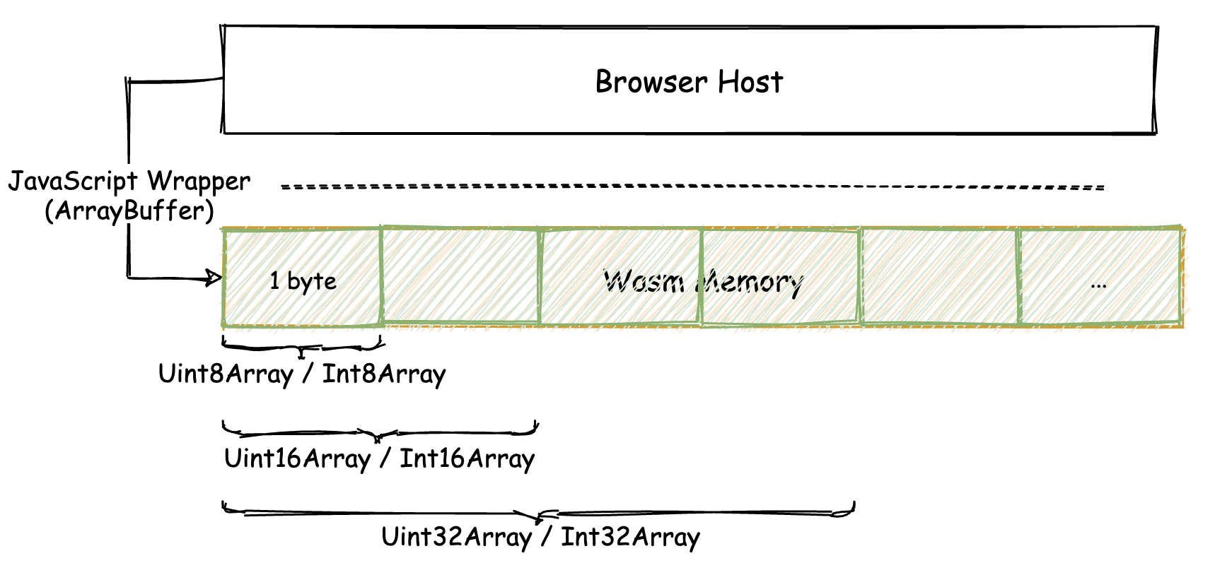 那么,接下来我们再把目光移到 WebAssembly Memory 身上,来看一看它是如何与“浏览器”这个 Web 宿主环境中的 JavaScript API 进行交互的。