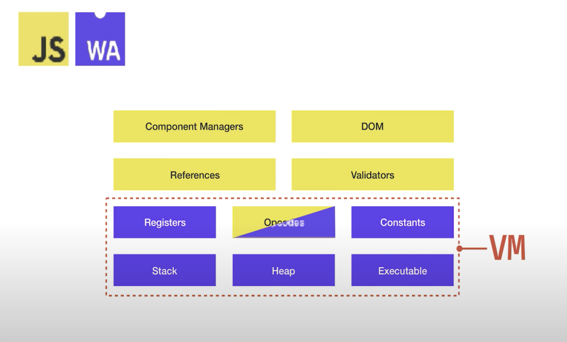 在 EmberConf 2018 年的技术会议上,来自 Ember.js 团队的 Yehuda Katz 向我们介绍了 Glimmer VM 与 Wasm 的整合情况。你通过上图可以看到,除了 OpCode 模块相关的部分逻辑仍然在使用 JavaScript 构建以外,整个 VM 的大部分功能都已经完成到 Wasm 的迁移。并且该 Wasm 版本的 Glimmer VM 也已经通过了所有的测试集 Case。