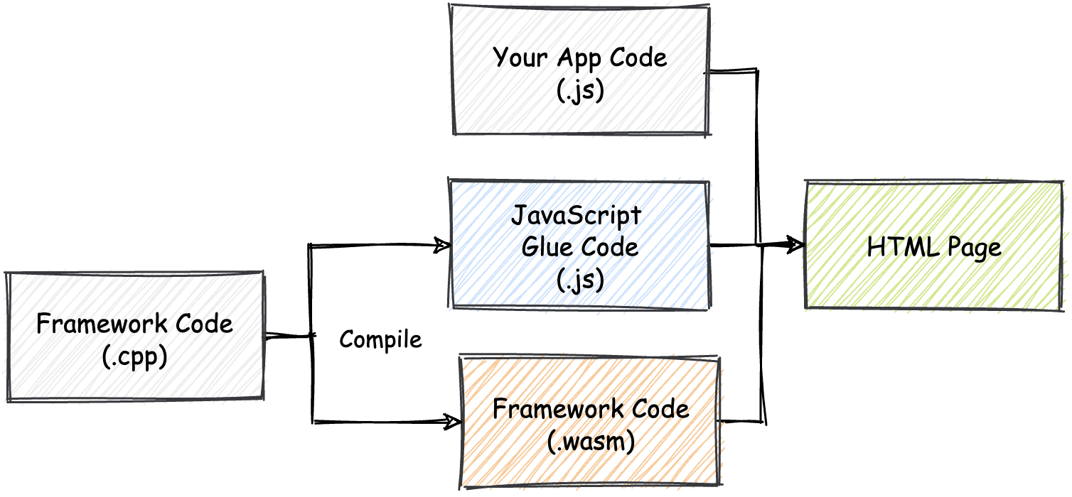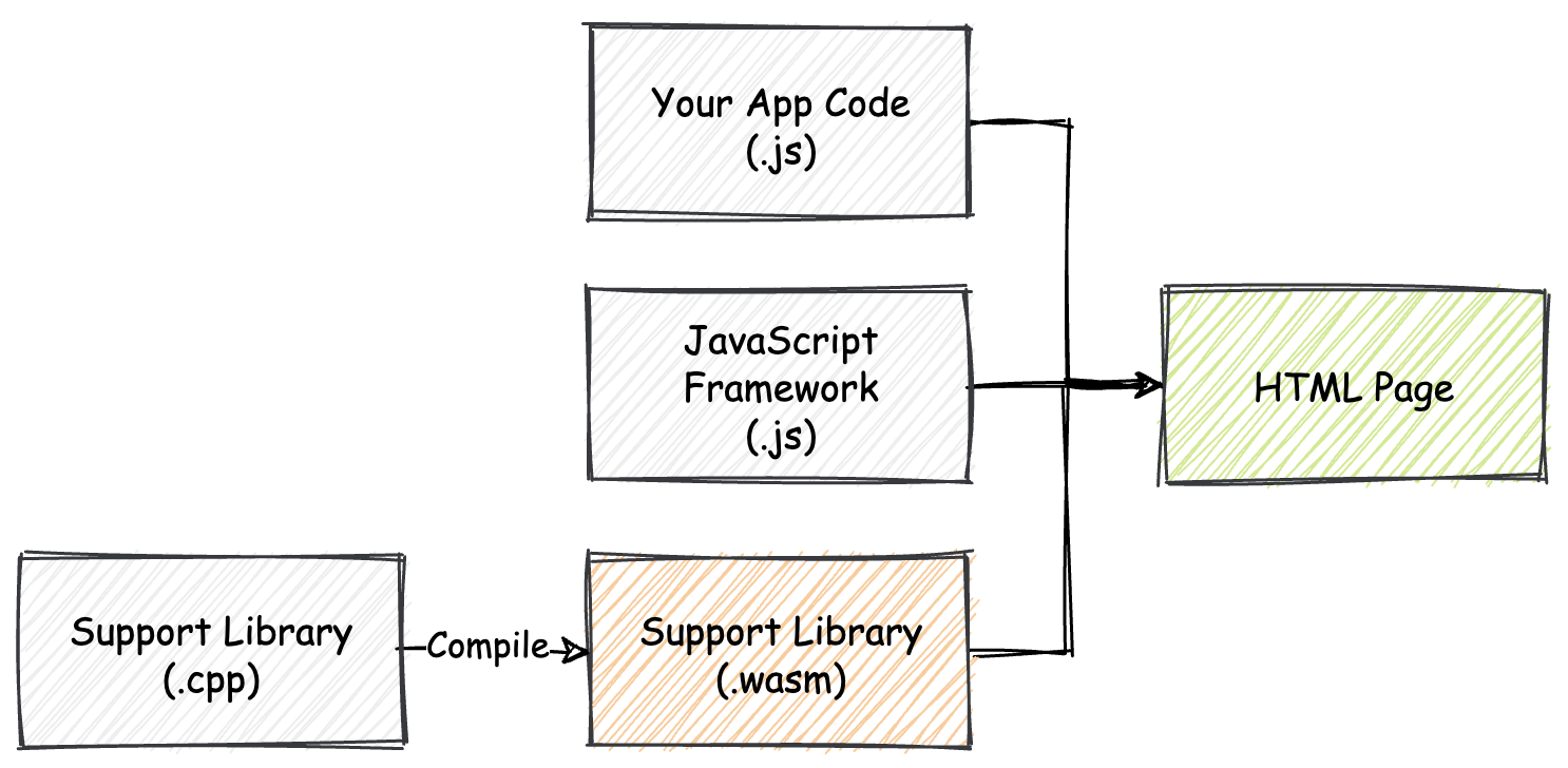 可以看到,这里 Wasm 本身只是作为一个模块,用于优化应用的某方面功能。而 Web 框架本身的源代码组成形式不会发生任何改变,应用仍然还是使用 JavaScript 来构建其主体结构。