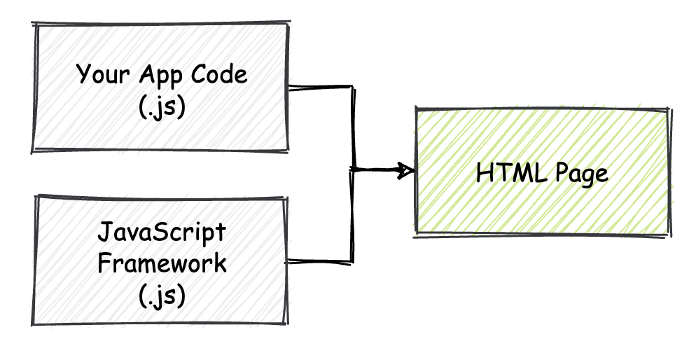 你可以看到,除去样式文件(CSS)以外,我们的 Web 应用程序仅由“框架代码”和“应用程序代码”两部分组成。这两部分代码全部由 JavaScript 语言进行编写。HTML 文件负责将这些 JavaScript 代码整合在一起,并确保在页面加载时执行它们。