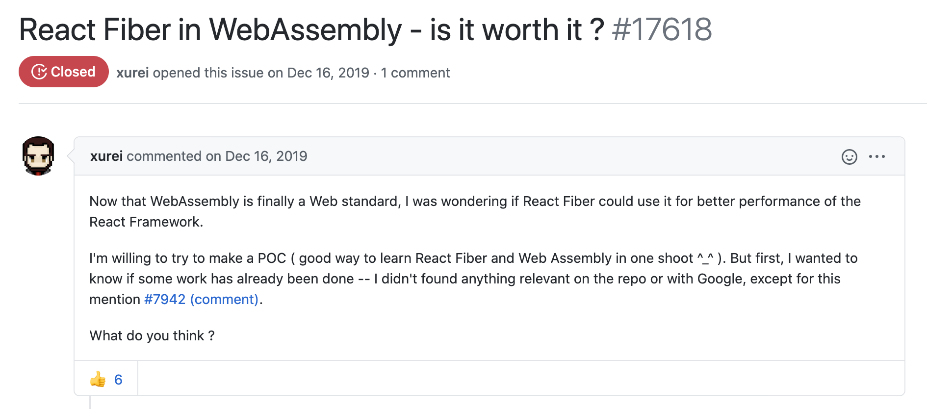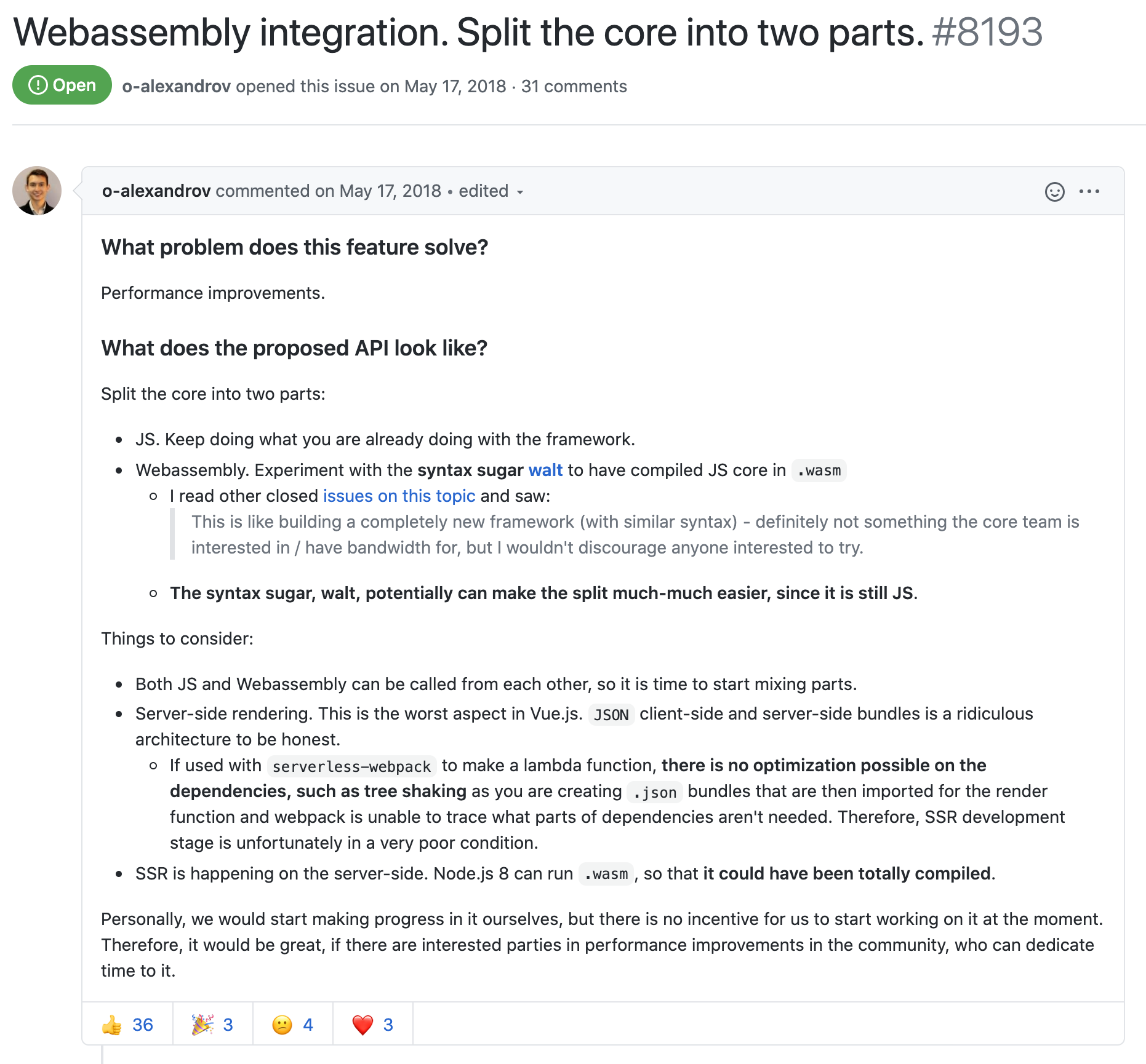 作为目前 Web 前端开发领域中最流行的框架之一。React 暂时还没有计划进行任何与 Wasm 相关的尝试。如下图所示,虽然社区中曾有人提议使用 Wasm 重写 React Fiber 架构中的 Reconciler 组件,但由于目前 Wasm 还无法直接操作 DOM 元素等标准上的限制,导致我们可预见,现阶段即使用 Wasm 重写 React 的 Fiber 算法,框架在实际处理 UI 更新时,可能也不会有着显著的性能提升。因此,对于 React 团队来说,投入产出比是一个值得考量的因素。