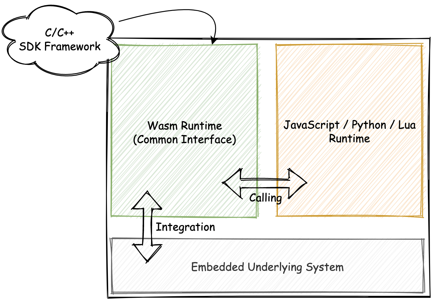 但现实情况是,并非所有的嵌入式设备,都可以直接满足这些高级编程语言的使用要求。由于不同语言的运行时差异性,并且考虑到实现成本,嵌入式设备无法独立地为每种语言运行时都提供单独的编程接口(一般为 C/C++),以供其与嵌入式设备进行交互。此时 Wasm 字节码的高密度、高性能以及可移植性,便使得人们有了可尝试的新选择。