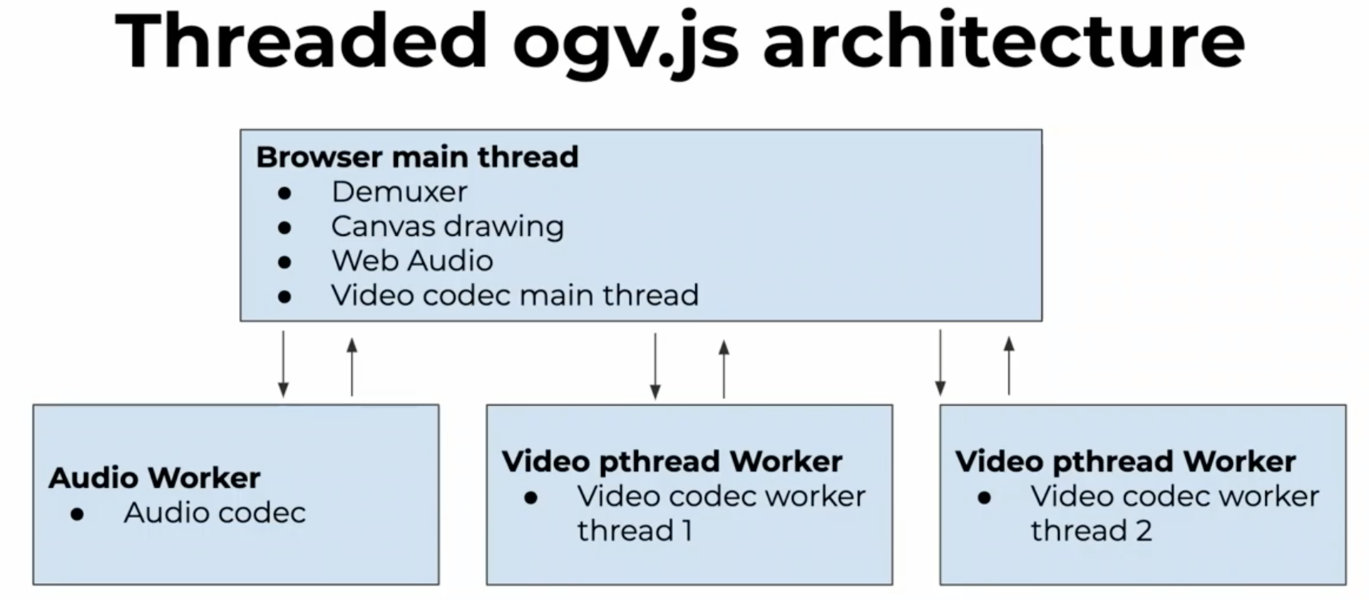 另一个值得讲的便是 ogv.js 对第三方编解码库(libogg、libvorbis、libtheora 等等)的复用。ogv.js 在构建时,直接使用了已有的一些 C/C++ 编解码库来完成对音视频流的编解码过程,而没有选择自己从头开始编写这部分功能。因此,得益于 Emscripten 提供的对 C/C++ 代码到 ASM.js / Wasm 代码的转译功能,ogv.js 的整个开发过程变得更加方便快速。