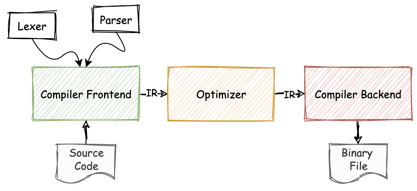 对于传统的静态语言编译器来说,通常会采用较为流行的“三段式”链路结构。如下图所示,三段式结构分别对应着整个编译器链路中三个最为重要的组成部分:编译器前端(Compiler Frontend)、中间代码优化器(Optimizer),以及编译器后端(Compiler Backend)。