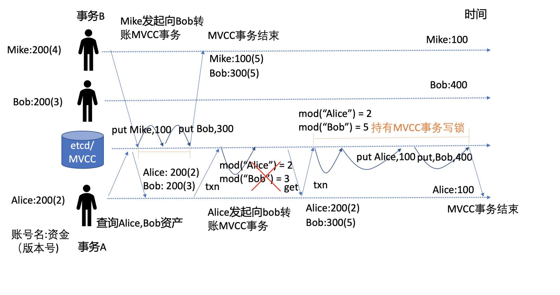 一开始时,Mike的版本号(指mod_revision)是4,Bob版本号是3,Alice版本号是2,资产各自200。为了防止并发写事务冲突,etcd在一个写事务开始时,会独占一个MVCC读写锁。