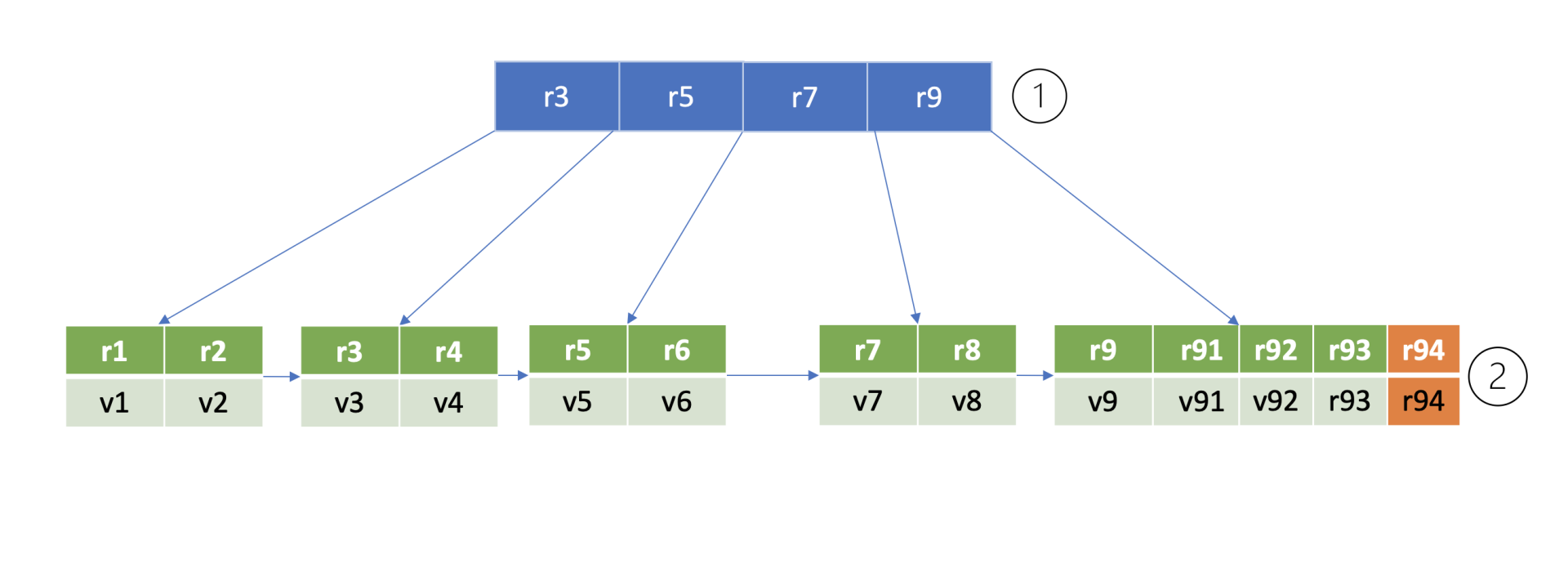 首先从boltdb的key bucket的root page里,二分查找大于等于r94的key所在page,最终找到key r9指向的page(流程1)。r9指向的page是个leaf page,B+ tree需要确保叶子节点key的有序性,因此同样二分查找其插入位置,将key r94插入到相关位置(流程二)。